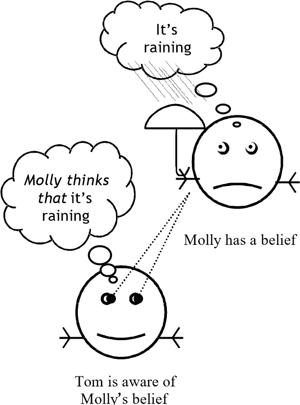 For instance, suppose Tom thinks it isn’t raining, and suppose he is aware of this belief and of Molly’s belief that it is raining. One of these beliefs must be false: either Tom or Molly has a false belief, so Tom is aware of a belief that is false. But does it necessarily follow that Tom can understand that one of these beliefs is false?