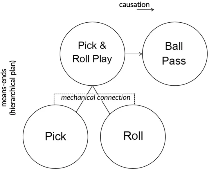Figure 2. Where one agent has to select an action based on which action the other performs, interference effects may be reduced if the agent can represent both actions as interrelated components of a single goal and not only in terms of the more distal goal (e.g. passing the ball, in a pick and roll play).