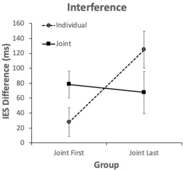 We believe that the three-way interaction was likely the result of the incongruent trials causing comparatively little visuomotor interference in the first block of trials when there was a Joint Action Goal, compared to when there was not a Joint Action Goal. To further investigate the three-way interaction, we subtracted the IES of congruent trials from the IES of incongruent trials (IES difference) for each participant, for each condition, giving us an index of how much the incongruent trials interfered with participants’ responses in each of the conditions. We conducted a mixed ANOVA, with Jointness as a within participants factor, and Group as a between participants factor, which revealed no main effect of Jointness, , , , and no main effect of Group, , (although this is close to significance, it does not permit us to draw any conclusions). However, there was an interaction between Jointness and Group, , , (see Fig. 5). Bonferroni corrected post-hoc t-tests revealed that Joint Action Goal IES differences were significantly larger than Individual Goal IES differences for the Joint First group, , , , and Joint Action Goal IES differences were significantly smaller than Individual Goal IES differences for the Joint Last Group, , , . There was no significant difference between the Joint First group and Joint Last group for Joint Action Goal Trials, , , , but Joint First IES differences were significantly smaller than Joint Last IES differences for Individual Goal trials, , , .