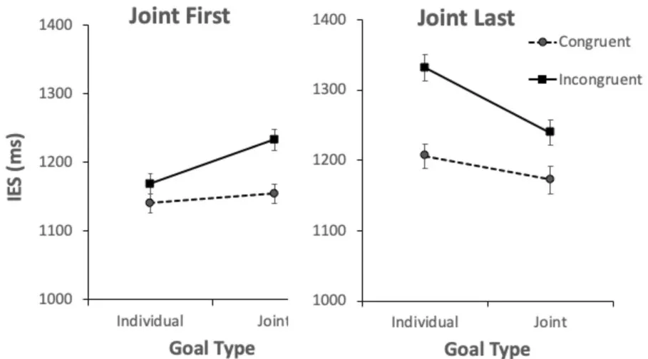 Post-hoc t-tests for the Joint Last Group revealed that congruent IES were significantly lower than incongruent trials’ IES for the Individual Goal condition, , , and congruent trials’ IES were significantly lower than incongruent trials’ IES for the Joint Goal condition, . Congruent trials’ IES in the Joint Goal condition were not different from congruent trials’ IES in the Individual Goal condition, , , however incongruent trials’ IES in the Joint Goal condition were significantly lower than incongruent trials’ IES in the Individual Goal condition, , , .